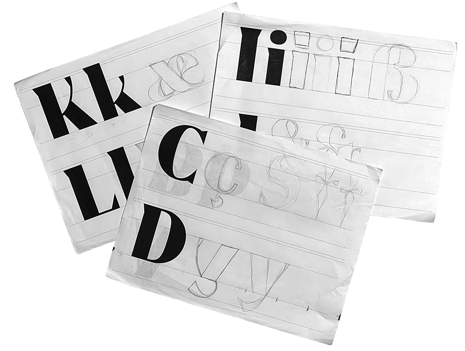 My best method for feeling out a potential typeface is through hand rendering. Without the demand for precision in digital rendering, these drafts allowed me to explore and reflect on Tyte’s fundamental elements. I started with rough ink sketches to conceptualize new forms and refined them later on sheets I designed for drafting precise outlines in graphite.